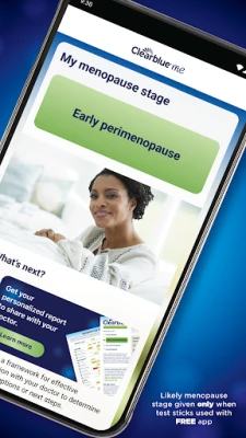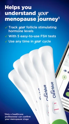 Menopause Stage - Clearblue® me app is designed for use with Clearblue® Menopause Stage Indicator tests to help you learn more about your menopause journey[1]. Together with the easy-to-use follicle stimulating hormone (FSH) tests over several days, the app will indicate your likely menopause stage as premenopause, early perimenopause, late perimenopause or postmenopause. The more you learn about your stage, the better prepared you can be.